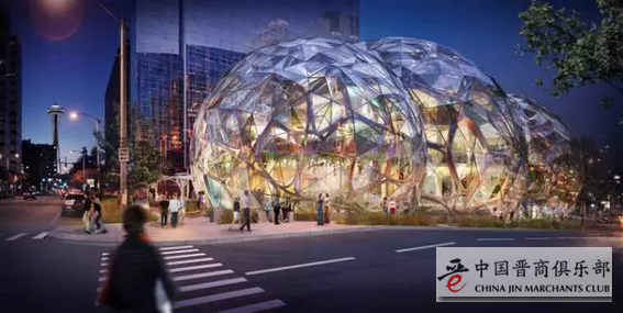 亚马逊走绿色风,在总部建了三个超大玻璃球,里面还种了300多种濒临灭绝的植物。