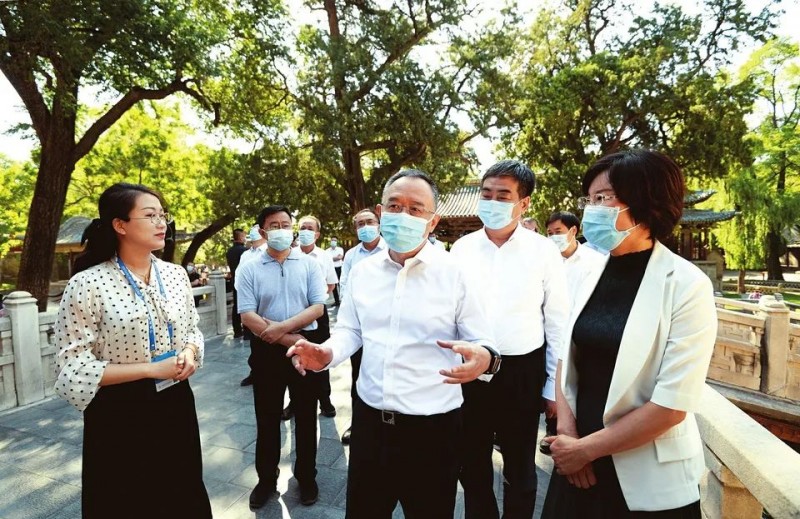 6月14日,省委副书记、省长金湘军来到晋祠博物馆,仔细察看宋金建筑和珍贵文物,了解历史、艺术价值,询问晋文化等研究阐释成果,并听取晋祠泉复流进展汇报。山西日报记者李兆民摄