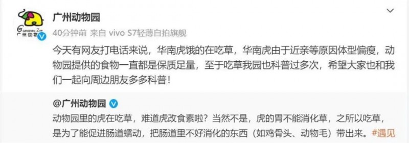 8月18日晚,广州动物园也通过官方微博发布消息解答网友疑问:今天有网友打电话来说,华南虎饿得在吃草,华南虎由于近亲等原因体型偏瘦,动物园提供的食物一直都是保质足量,至于吃草我园也科普过多次,希望大家也和我们一起向周边朋友多多科普。