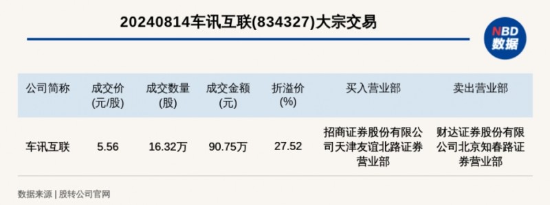 2024年8月14日,新三板创新层公司车讯互联(834327,收盘价:4.36元)发生一笔大宗交易,成交价5.56元/股,成交数量16.32万股,成交金额90.75万元,溢价27.52%。买入营业部是招商证券股份有限公司天津友谊北路证券营业部,卖出营业部是财达证券股份有限公司北京知春路证券营业部。