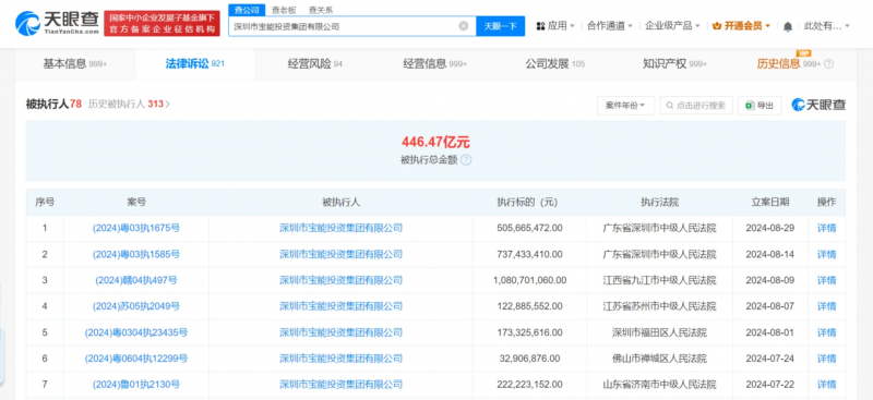 天眼风险信息显示,深圳市宝能投资集团有限公司现存78条被执行人信息,被执行总金额超446亿元,此外还存在多条限制消费令、失信被执行人(老赖)和终本案件信息。