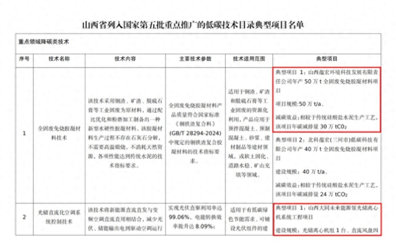 《目录》共有103项技术,既有前沿性、降碳潜力大的“示范类技术”,又有相对成熟、适合规模化应用的“推广类技术”,其中,能源绿色低碳转型类技术20项,工业、建筑、交通、农业等重点领域降碳类技术59项,数智赋能类技术14项,非二氧化碳减排类技术7项,储碳固碳类技术3项。本次山西省共有8个应用相关技术的项目成为典型项目,包括应用重点领域降碳类技术的2个典型项目、应用数智赋能类技术的2个典型项目、应用非二氧化碳减排类技术的4个典型项目。