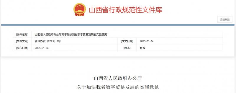 核心提示:3月20日消息,经省委、省政府同意,《关于加快我省数字贸易发展的实施意见》开始实施。其中提出,支持太原市、大同市申建国家服