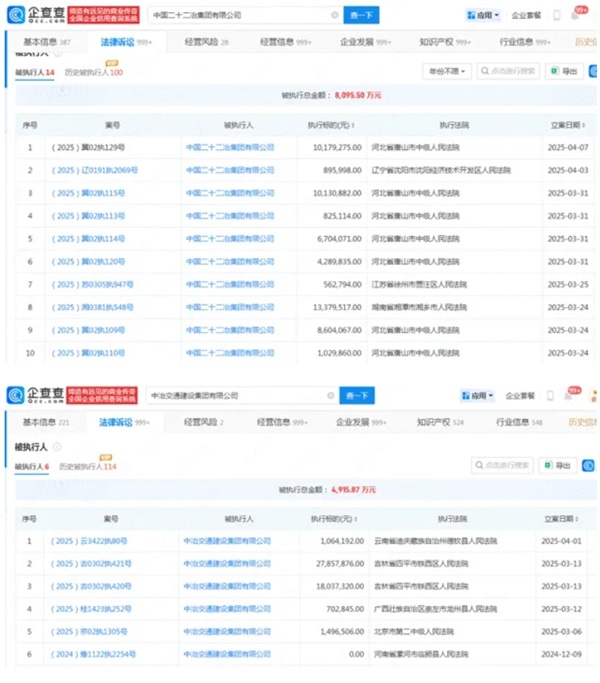 不过,据企查查显示,进入2025年以来,中国中冶旗下多家控股子公司已陆续出现被法院列为“被执行人”的情况。