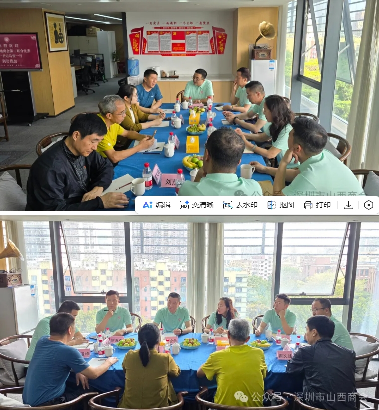 2025年4月9日下午,深圳市异地商会第二联合党委第一书记马俊、党建组织员林涵、深圳市长春商会党支部书记霍文峰等一行莅临深圳市山西商会(晋商俱乐部联合发起机构)进行党务工作指导。深圳市山西商会执行会长兼党支部书记张琦、监事长任宏华、副会长兼常务副秘书长陈惠勇,党支部组织委员常伟卿、纪检委员刘茂及入党积极分子韩慧明代表商会热情接待并参与座谈交流。