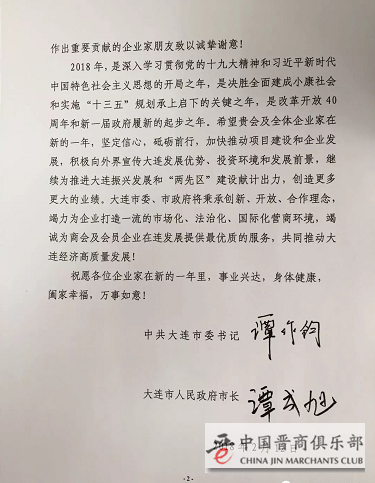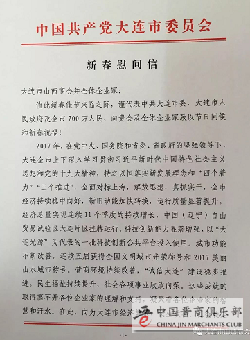 春节前夕,大连市山西商会(中国晋商俱乐部联合发起机构)收到大连市委员会市委书记谭作钧、市长谭成旭署名慰问信。