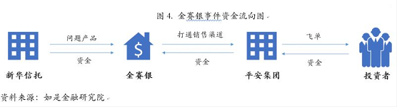 其中涉案规模最大,最为引人注目的是金赛银基金事件。2015年10月,深圳金赛银基金管理有限公司陷入60亿元兑付危机中,金赛银负责人王维奇跑路,客户的几十亿资金无处追讨,无处申诉;而平安人寿被曝由其业务员向客户兜售的巨额金赛银理财产品无法兑付。通过高档豪华会所装门面、拉拢政府官员打着政府项目的旗号推销、打平安保险担保的幌子、宣传公司挂牌上海股交中心等方式,金赛银公司吸引了大量投资者购买其理财产品,但这些钱实则进入了王维奇的个人私款。这一事件的背后,存在着一条“有毒资产”转嫁链条:信托公司把信托贷款、债权等问题产品转给第三方私募接盘;私募公司金赛银通过动员平安员工“接飞单”等方式,打通了平安集团的销售渠道,募得巨额资金,最终挪作它用,导致原本就存在问题的资产链条断裂。