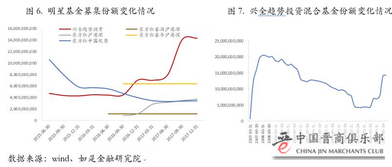 而一些正规投资渠道的项目或理财产品,往往不会存在反复融资的情况,大多会将融资规模控制在一定范围内。从图6列举的五只明星基金的募集份额情况来看,东方红睿满沪港深、东方红睿华沪港深、东方红沪港深、东方红中国优势的募集份额均维持得十分平稳,其中前两只基金的份额在成立以来均维持不变,东方红中国优势的份额甚至还有下降。兴全趋势投资混合基金的募集份额虽然在近两年来有较快的增长,但其募集份额规模较更早时候的2008年来看,也有明显的下滑;2008年3月31日,该基金的募集份额一度高达20536270957份。