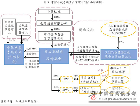 而规范的金融产品,尽管其结构设计较为复杂,却有容易变现的底层资产作为保障。以国内首只REITs中信启航为例,其资产结构较为复杂,却十分清晰,拥有北京、深圳的中信证券大厦的租金收入作为底层资产。在这一产品中,中信证券首先在天津注册成立两家全资子公司——天津京证、天津深证,然后将北京中信证券大厦、深圳中信证券大厦的房地产权属分别过户天津京证、天津深证,之后再将天津京证、天津深证的全部股权转让给中信金石基金管理有限公司拟发起设立的非公募基金的全资孙公司中信金石基金。中信金石基金作为非公募基金的投资载体,向中信证券收购天津京证和天津深证的股权,以达到为非公募基金的投资者提供投资业务的目的。另一方面,中信证券成立中信启航专项资产管理计划,募集资金100%认购基金份额,按70.1%:29.9%的比例划分为优先级和次级,向非公募基金出资。项目公司获取的租金收入用于分配专项资管计划的收入。
