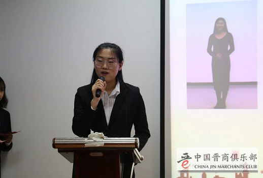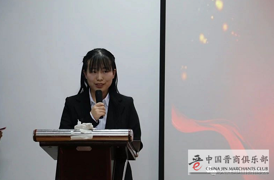 大连外国语学院山西太原籍学生武婷婷代表厚朴学子发言。她对商会、厚朴、成长导师给予的帮助表示感谢,并表示,自己将努力学习,用厚朴自强、感恩、分享的理念帮助更多的人。