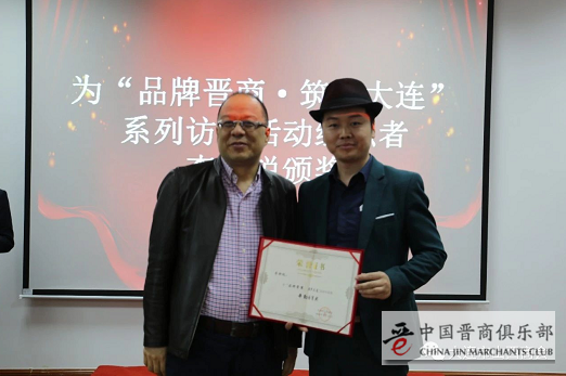 商会副会长于学义为“品牌晋商 筑梦大连”组织者商会会员李新锐颁发荣誉证书(商会会员温蓝代领)