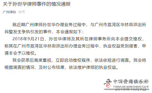 10月9日,广州市律师协会发布通报,表示已获悉此事并高度重视,“立即启动维权程序,依法依规进行调查,我会将根据调查的情况,及时公布结果,依法维护律师的执业权益”。