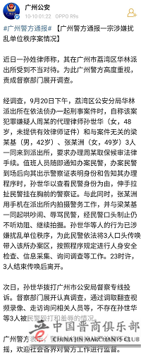 10月5日,女律师孙世华发帖称,9月20日,她到广州荔湾区公安分局华林派出所,沟通办理委托人的取保候审事宜,遭遇警察“碰瓷”。