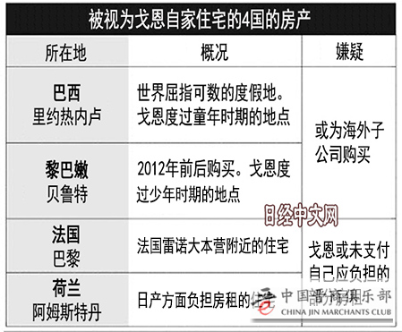 相关人士表示,戈恩利用日产方面资金获得住宅的情况除了巴西里约热内卢和黎巴嫩贝鲁特之外,还有法国巴黎和荷兰阿姆斯特丹,合计为4个国家。里约和贝鲁特是会长度过童年和少年时期的故乡,巴黎和阿姆斯特丹则靠近法国雷诺的大本营。