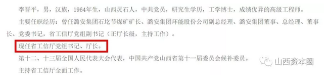 不过,这一切于2019年初发生改变,李晓波“接棒”退休的耿彦波,赴任太原市市长一职,就此省工信厅党组书记、厅长皆已出缺。而与此同时,原潞安集团“掌门人”李晋平卸任集团党委书记、董事长职务,辞别工作已逾30年的潞安集团赴任山西省工信厅。
