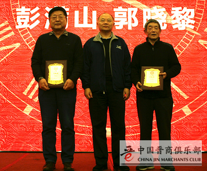 商会顾问彭满山为商会优秀常务副会长米瑞蓉、常捷、武超、李辉、郭刚、朱义林、张磊、优秀副会长翟继林、葛万宏、杜保军、施军、郭亮、王彬颁发奖牌。