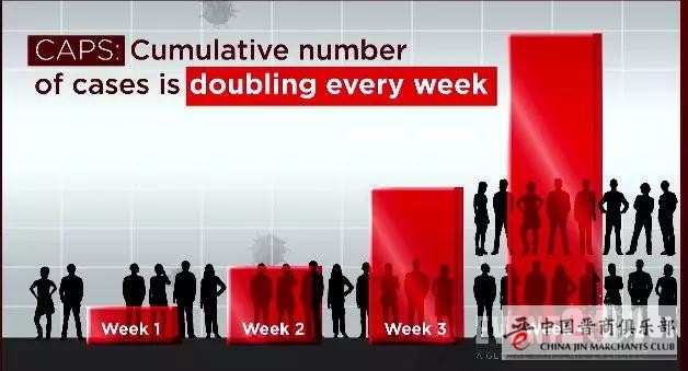 平均每位感染者将病毒传播给两人,确诊案例以每周两倍的速度攀升:
