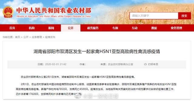 【湖南邵阳发生一起H5N1亚型高致病性禽流感疫情】农业农村部新闻办公室2月1日发布,湖南省邵阳市双清区发生一起家禽H5N1亚型高致病性禽流感疫情。