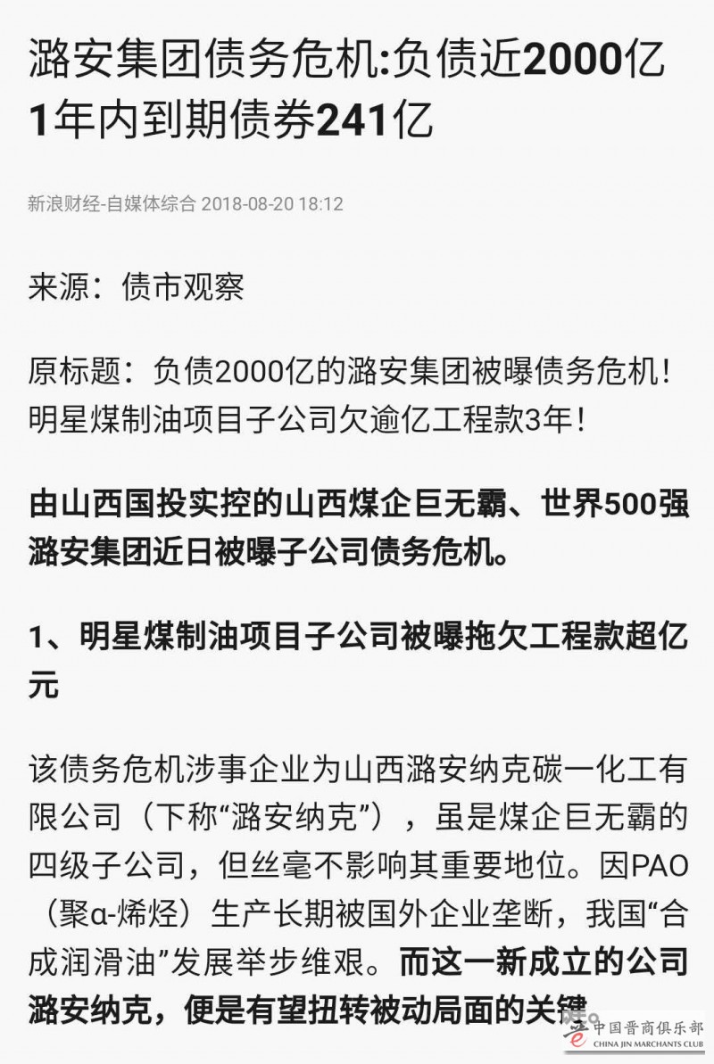 小编也注意到了同年即2018年8月,关于山西大型国企潞安集团的一篇报道,潞安集团债务危机:负债近2000亿 1年内到期债券241亿。