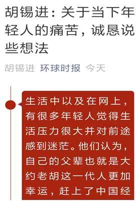 这才几天?胡总编就无视这幸福的93%,大谈“当下年轻人的痛苦”,而且言之凿凿的说“每一代的年轻人皆如此”。