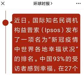 胡总编领导的《环球时报》数日前刚刚公布了国际知名民调机构益普索的“疫情中世界各地幸福状况”排名。排名显示,中国人的幸福率为93%。