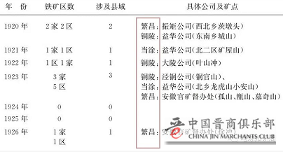 1920—1926年安徽新注册铁矿统计,可见铁矿几乎完全在江南的马鞍山、芜湖、铜陵,其中繁昌桃冲铁矿的年产量1925年达到了31万吨。(来源:《中国近代经济地理·华中卷》,华东师范大学出版社)