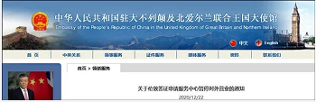 中国驻英国大使馆网站12月22日消息,驻英国大使馆发布《关于伦敦签证申请服务中心暂停对外营业的通知》: