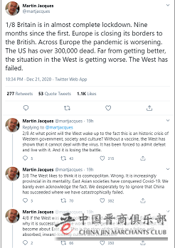 被中国网友善意调侃为“知名中吹”、“英国开眼看世界第一人”的学者马丁·雅克(Martin Jacques)于12月21日,连发8条推特,直言“西方失败了”。