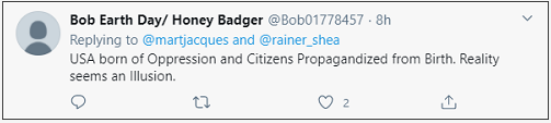 一位坐标是美国佛罗里达州的网民评论称,“美国是在压迫下诞生的,民众从出生起就接受政治宣传。现实如同一个幻象。”