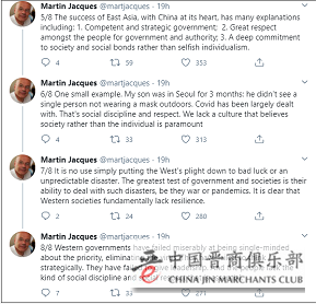 对于以中国为首的东亚国家普遍在抗疫中表现较好,马丁·雅克分析称,这是因为民众信任政府、科学权威,有社会责任感,而不是向西方人一样“个人主义,自私自利”。