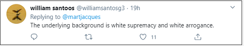 马丁的推文下方,有网民评论,“深层背景是白人至上主义,和他们的傲慢。”