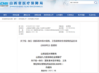 从2021年3月1日起,全省统一执行《国家基本医疗保险、工伤保险和生育保险药品目录(2020年)》(以下简称国家目录)。省医保局、省人社厅《关于执行2019版<国家基本医疗保险、工伤保险和生育保险药品目录>的通知》(晋医保发〔2019〕65号)中《原山西省药品目录中暂予保留的药品》(108种)全部调整出山西省医疗保险、工伤保险、生育保险基金支付范围;对《山西省中药饮片部分》中部分品种的名称进行合并、规范,规范后共217种,与国家目录中的中药饮片一并纳入山西省医疗保险、工伤保险、生育保险基金支付范围。医院制剂暂按原目录执行。