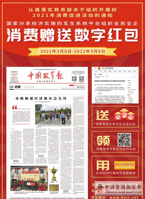 让我们通过全民全企消费赠送“数字红包”活动及“数字红包”效应,形成消费促进活动的新常态,全面推动消费,畅通经济社会循环,助力十四五开好局,乘势而上开启全面建设现代化国家的新征程。