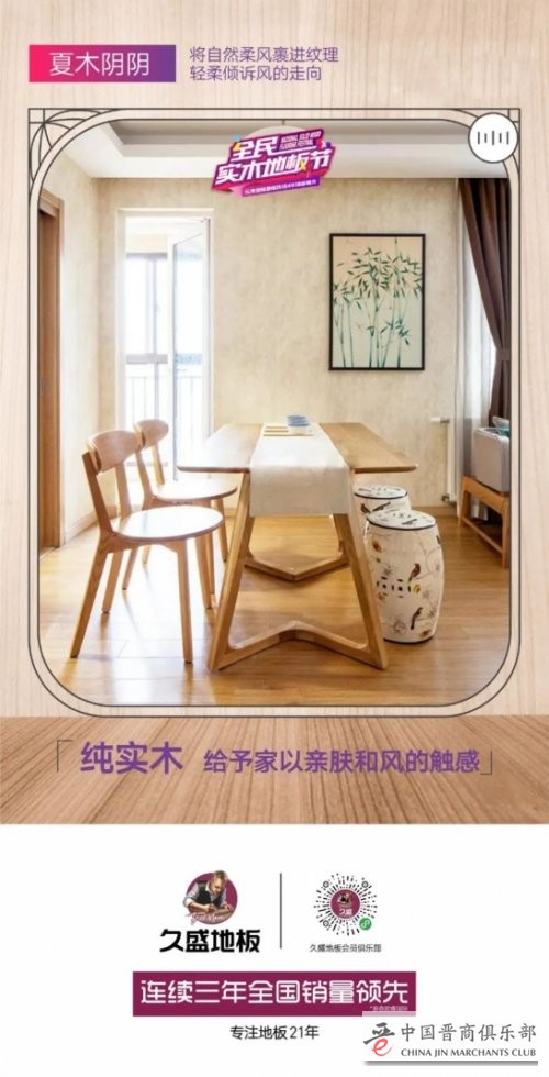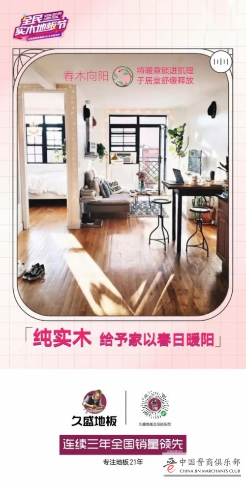 2019年,是久盛地板“全民实木地板节”的开创元年,久盛把该节日设于每年春光最美的4月里,一年一季,一期一会。第一季全民实木地板节,以“让孩子过的更好一点”作为主题,让全国消费者充分明白装修污染给孩子带来的巨大影响。一战成名,久盛成功塑造了久盛全民实木地板节的超级品牌日,为大众带来温暖的同时也带来健康。第二季久盛地板全民地暖节全新出发,以“宅进自然里”为主题,饱含了久盛对于每一个家庭的健康期许!从“让孩子过得更好一点”,到“让家人过得更好一点”,久盛地板拳拳之心,让一切爱温暖如常。