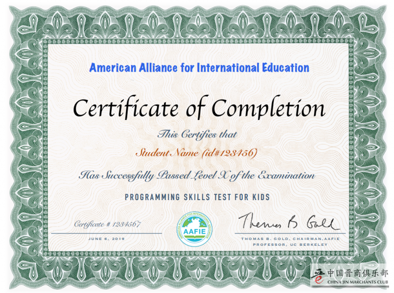 国际少儿编程技术等级考试简称” PSTK”,面向对象为6-18岁学习编程并有相应能力的海内外青少年,项目考试通过的学员将统一颁发由加州大学伯克利分校教授美国国际教育联盟执行总裁Thomas B. Gold, Ph.D签名的能力水平证书,该证书包含学生个人身份信息,编号唯一,可登陆AAFIE官网查询。