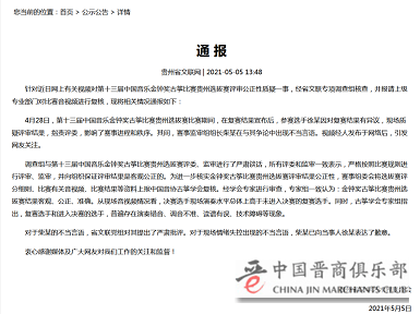 4月28日,第十三届中国音乐金钟奖古筝比赛贵州选拔赛比赛期间,在复赛结果宣布后,参赛选手徐某因对复赛结果有异议,现场质疑评审结果,指责评委,影响了赛事进程和秩序。其间,赛事监审组组长柴某在与其争论中出现不当言语。视频经人发布于网络后,引发网友关注。
