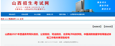 6月13日,山西省招考中心发布有关军队院校、公安院校、司法院校、北京电子科技学院、中国消防救援学院等面试体检工作的通知,相关考生务必要看。