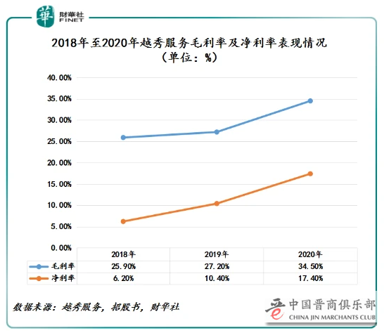 依托较高管理费收入的优势及“住管+商管”的双轮驱动,越秀服务盈利能力趋于领跑态势。据招股书显示,2020年越秀服务的毛利率及净利率分别为34.5%、17.4%,分别高于2020年百强企业毛利率均值的24.55%、净利率均值的8.9%。