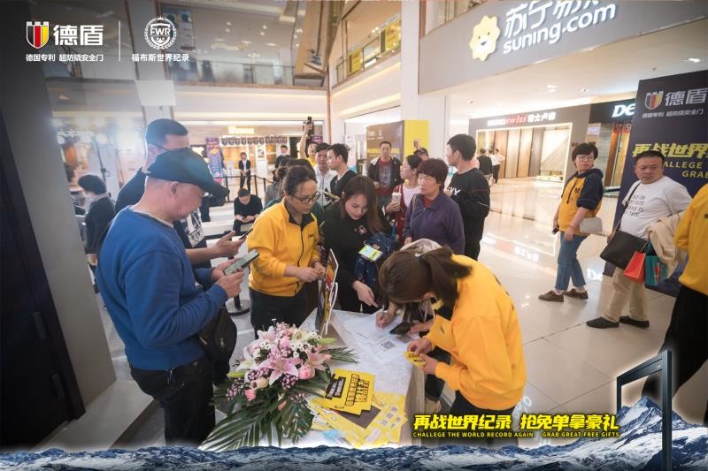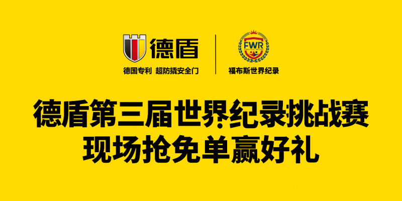 但德盾仍未满足,今年9月5日武汉徐东欧亚达一号店现场,德盾将挑战更高的难度,承受飞踹次数再次攀升。挑战的规则也和前几次相同,接受挑战的德盾安全门需呈现门扇与门框45°角的开启状态,并打开所有的锁点,“飞踹”志愿者须大力踹向门面,门体与锁点在接受规定次数的暴力冲撞之后,仍能正常使用,即为挑战成功。要知道,飞踹次数哪怕只增加一次,难度都呈爆发式增长。