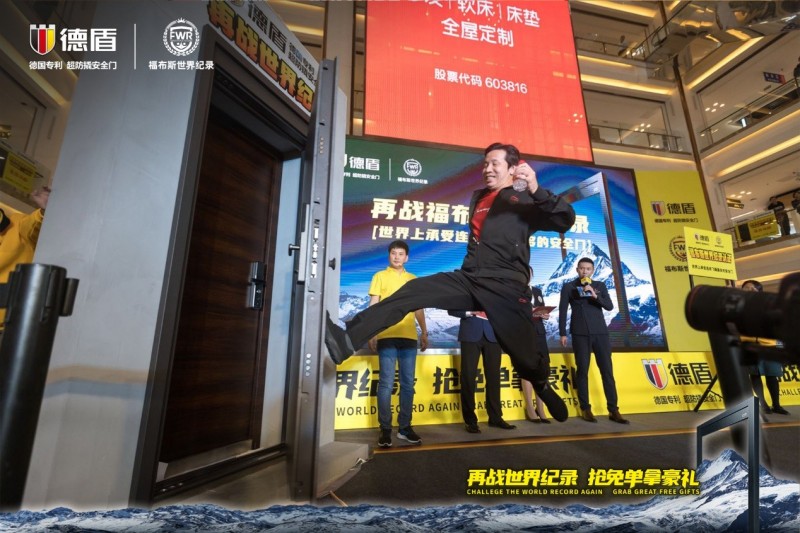去年7月份的挑战,德盾以承受连续飞踹100次的成绩创下了安全门领域的第一个世界纪录,从全新维度开创了行业的进步之路。但仅仅成为世界纪录的创造者并非德盾的最终目标,创新与超越的精神内核不断促使着德盾去挑战更高的目标。同年10月份的上海,德盾再度挑战,150次的飞踹过后,门锁依然完好无损并开启自如,这也意味着德盾第二次刷新了福布斯世界纪录榜单。