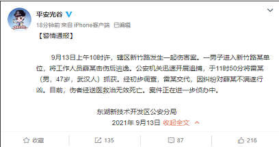 9月13日上午10时许,辖区新竹路发生一起伤害案。一男子进入新竹路某单位,将工作人员薛某击伤后逃逸。公安机关迅速开展追捕,于11时50分将雷某(男,47岁,武汉人)抓获。经初步调查,雷某交代,因纠纷对薛某不满遂行凶。目前,伤者经送医救治无效死亡。案件正在进一步侦办中。
