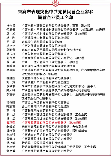 近日,在来宾市两新组织党工委、市工商联共同举办的来宾市表现突出中共党员民营企业家和民营企业员工表扬活动中,双蚁药业党支部书记、副总经理曾秋菊获评“来宾市表现突出中共党员民营企业员工”。