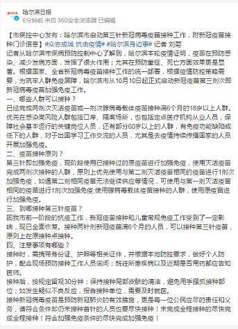 记者从哈尔滨市疾病预防控制中心了解到,哈尔滨本轮疫情证明,疫苗在预防感染、减少发病方面,发挥了很大作用;尤其在预防重症、死亡方面效果更是显著。根据国家、全省新冠病毒疫苗接种工作的统一部署,根据疫情防控策略需要,为筑牢人群免疫屏障,哈尔滨市从10月10日起正式启动新冠疫苗第三剂次即新冠病毒疫苗加强免疫工作。