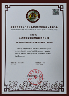 会议颁发了 2020 年度行业十强牌匾,专委会专家组成员聘书。山西中德塑钢型材有限责任公司获得中国轻工业塑料行业(异型材及门窗制品)十强企业第四名,中国塑料异型材标准委员会委员、中德集团执行副总裁张军被专委会聘任为专家组专家。