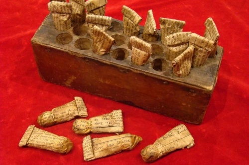 > 上图是克里米亚战争(1853-1856)时期的步枪弹。纸质的包装,里面是子弹和火药,使用前用嘴咬开,将火药和子弹灌入步枪。