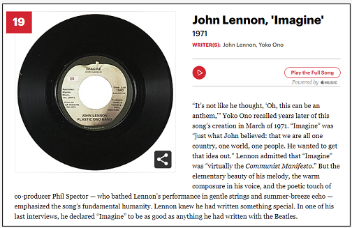 今年,《滚石》将其评为“人类史上最伟大的500首歌曲”第19位。该杂志介绍,《想象》传递了约翰·列侬“同一个国家,同一个世界,同一个种族”的信念。