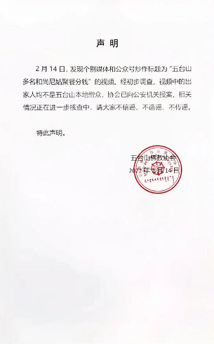 2月14日,五台山佛教协会微博发布声明称,14日发现个别媒体和公众号炒作标题为“五台山多名和尚尼姑聚餐分钱”的视频。经初步调查,视频中的出家人均不是五台山本地僧众,协会已向公安机关报案,相关情况正在进一步核查中,请大家不信谣、不造谣、不传谣。