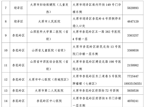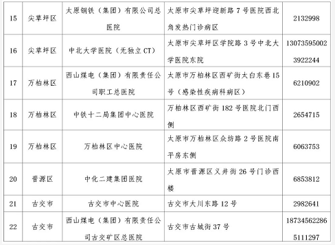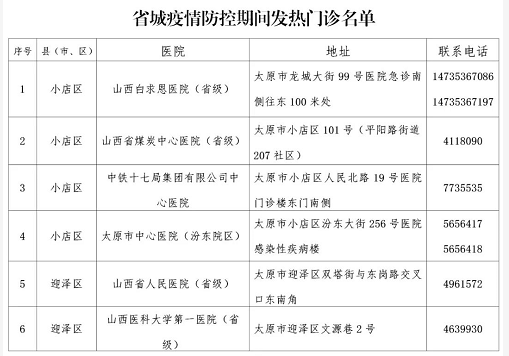 为有效应对新冠肺炎疫情,方便群众合理就医,太原市卫健委公布省城25家发热门诊名单。市民一旦出现发热、干咳、乏力、咽痛、嗅(味)觉减退、鼻塞、流涕、结膜炎、肌痛和腹泻等症状,或有重点地区旅居史的,请立即选择就近的发热门诊就医。