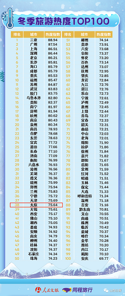 据了解,人民文旅与同程旅行联合发布的冬季旅游热力图,基于2021年11月至2022年1月期间的旅游热度数据,旨在分析盘点全国冬季旅游市场表现,为旅行行业消费、投资、管理决策提供参考。此次跻身排行榜前50名,太原文旅有哪些表现可圈可点?