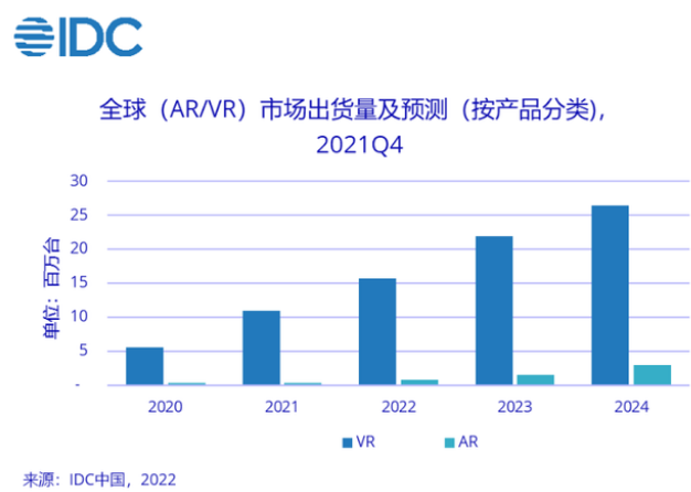 据国际数据分析公司IDC最新发布的《2021年第四季度全球AR/VR头显市场季度跟踪报告》显示,2021年全球AR/VR头显出货量达到 1123 万台,市场同比增长 92.1%。其中VR头显出货量达1095万台,突破年出货一千万台的行业重要拐点。预计2022年全球VR头显出货量将突破1573万台,同比增长43.6%。